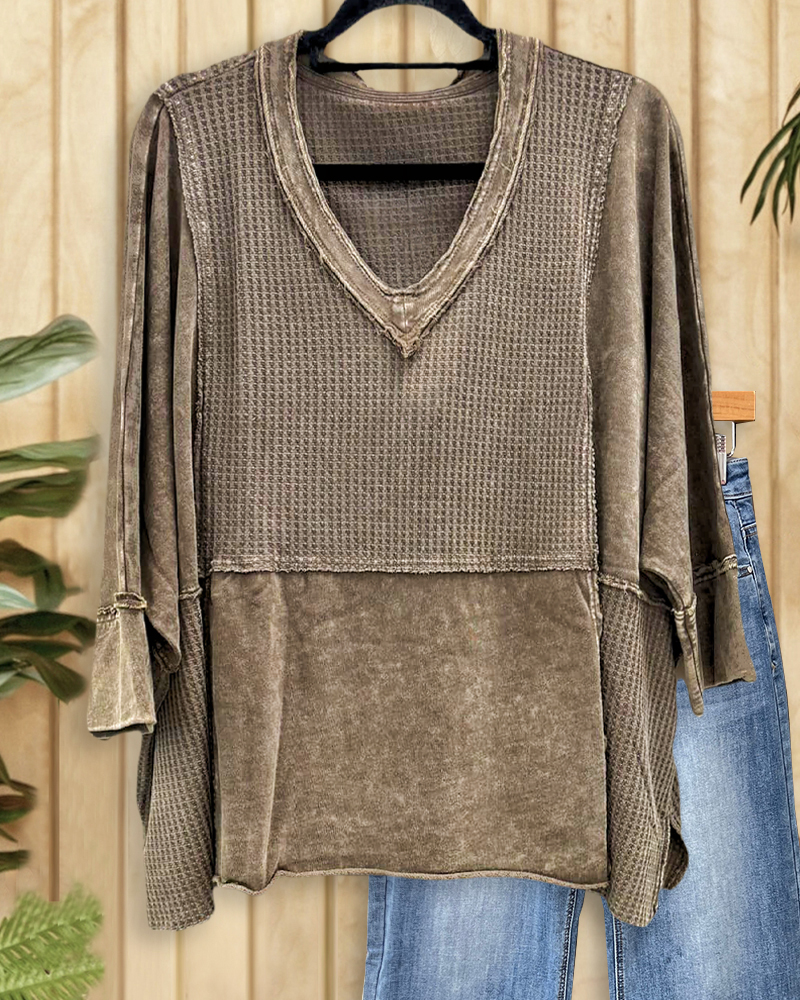 Waffle Patchwork Retro V Neck Shirt