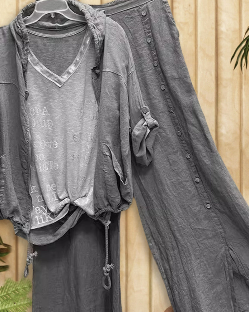 Distressed Solid Color Hooded Casual Wide Leg Pant Suit