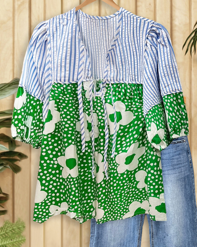 Striped & Floral Print Cozy Tie Neck T-Shirt