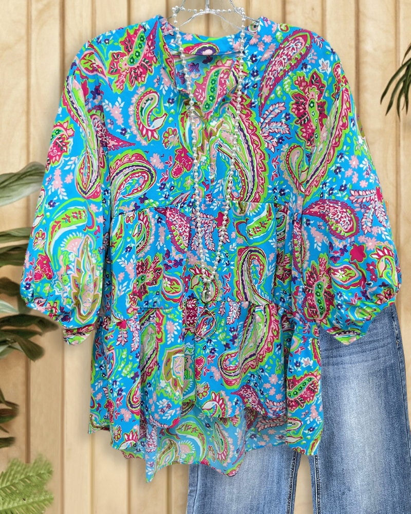 Paisley Print V Neck Boho Tiered Blouse