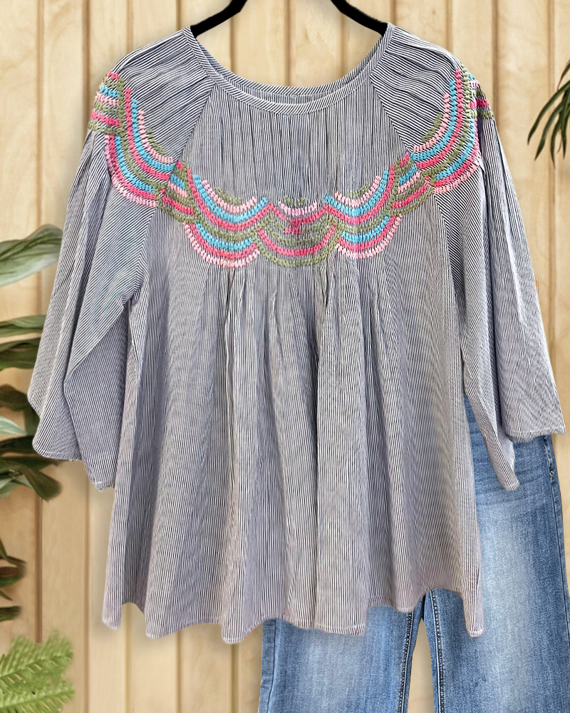 Embroidered Detail Striped Unique Round Neck Blouse