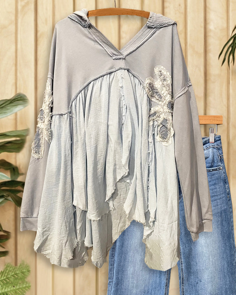 Flower Applique Girly Patchwork Irregular Hem Hooded Blouse