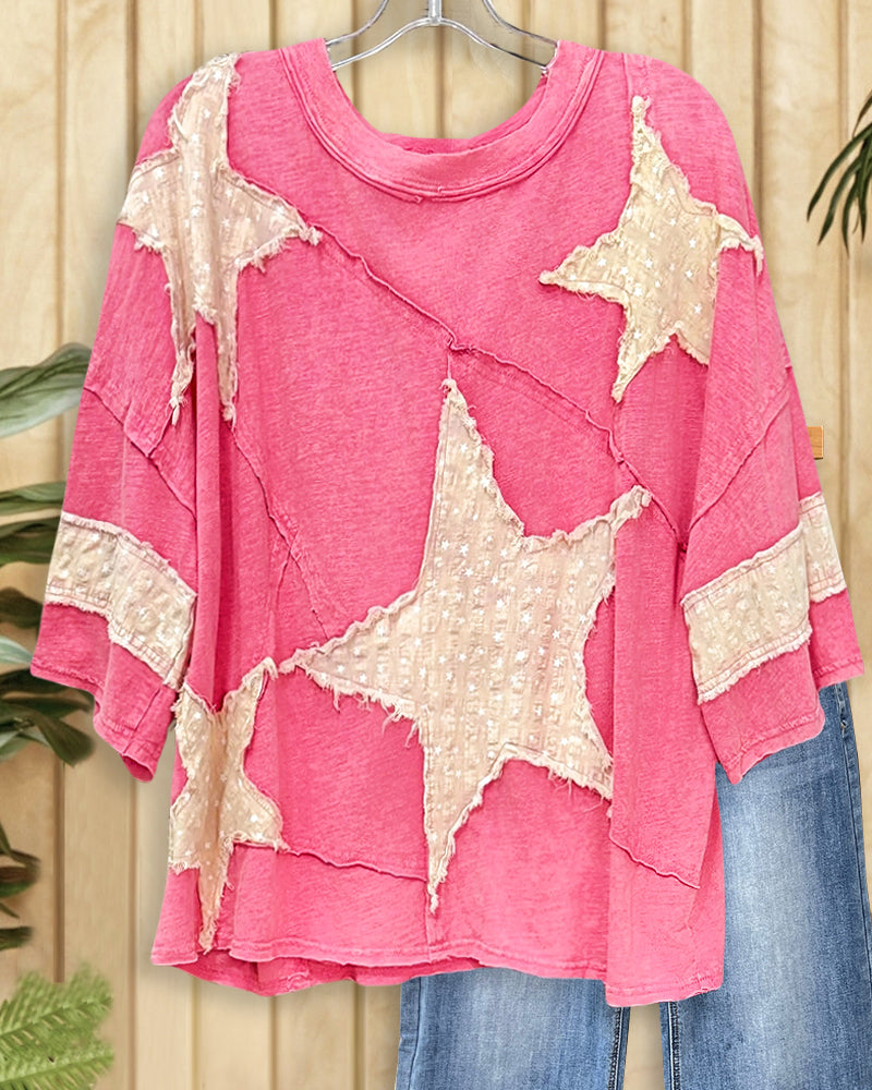 Star Applique Print Casual Round Neck Blouse