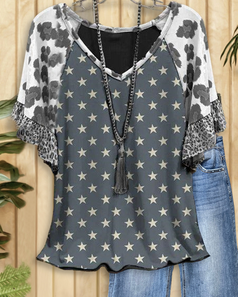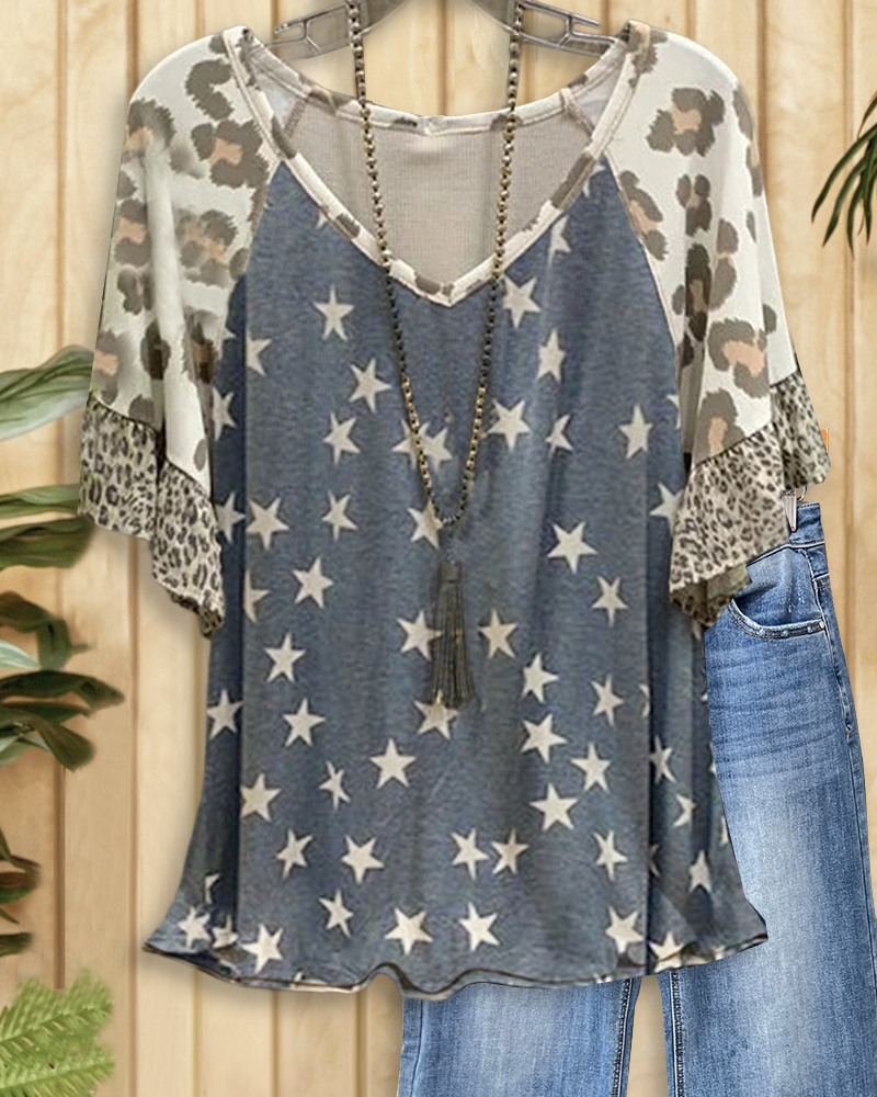 Leopard & Star Print Casual Raglan Sleeve T-Shirt