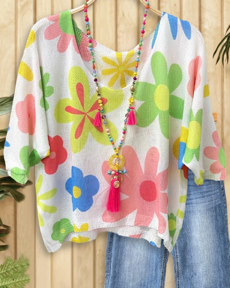 Multicolor Daisy Print Cute Knitted T-Shirt