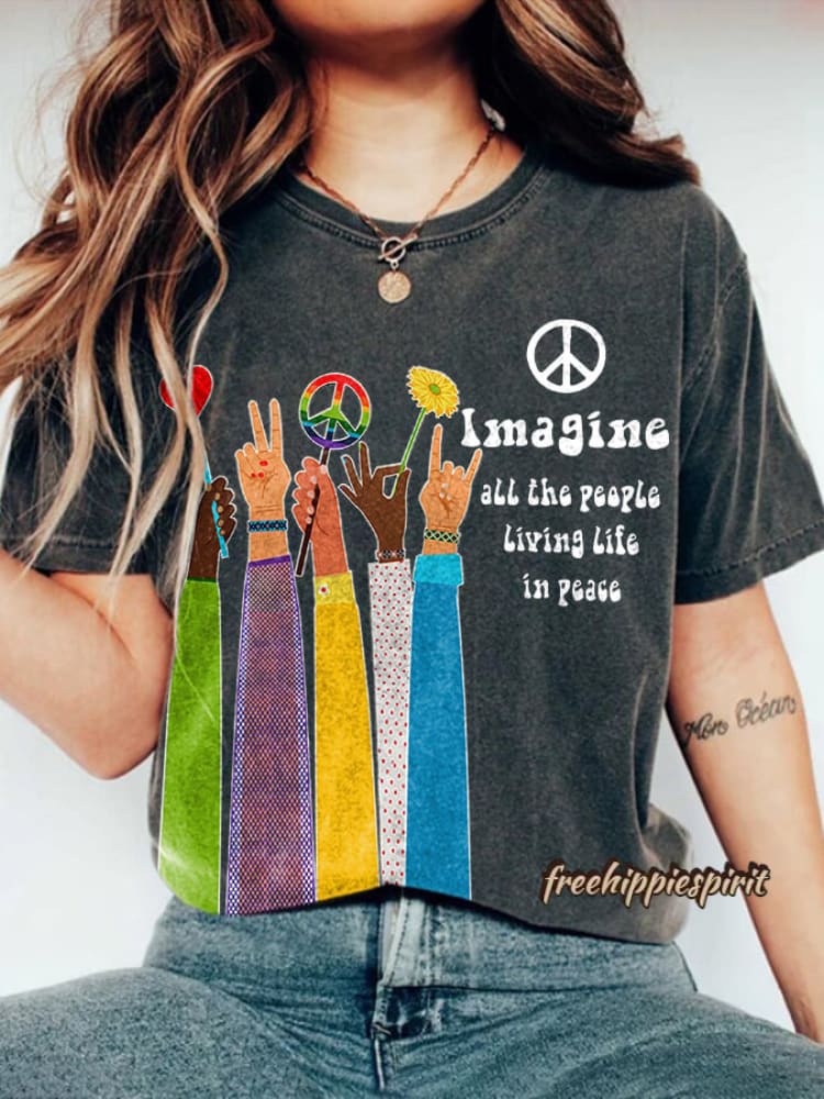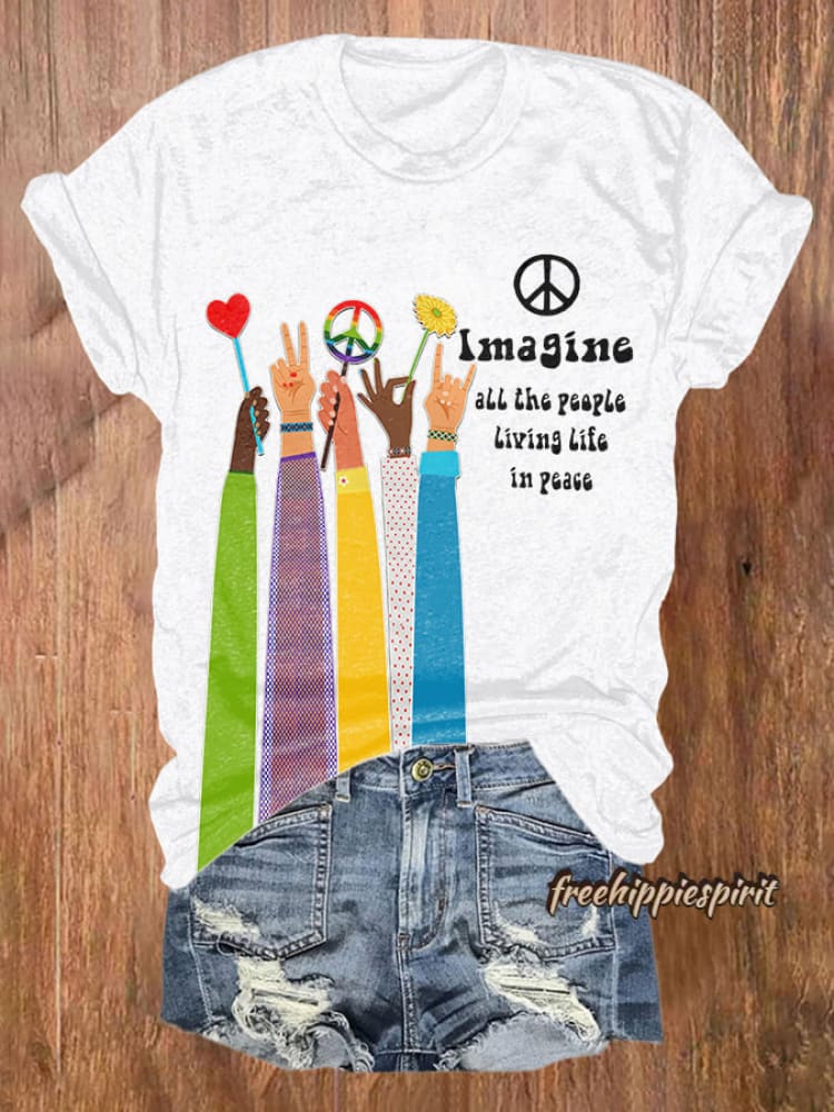 Retro Hippie Imagine All The People Living Life In Peace Print Shirt