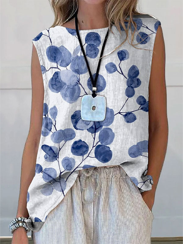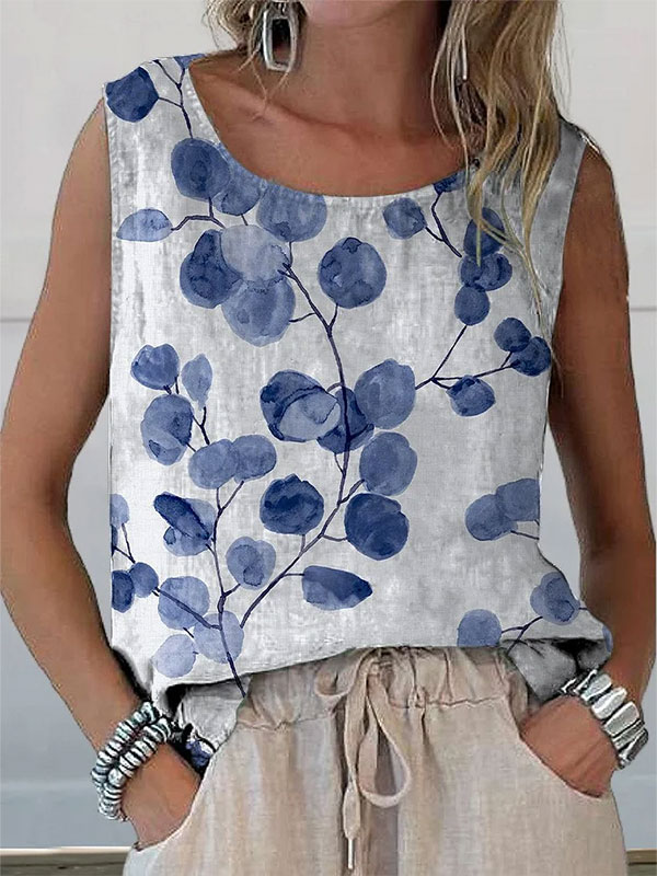 Women's Vintage Blue Floral Art Print Casual U Neck Cotton Shirt