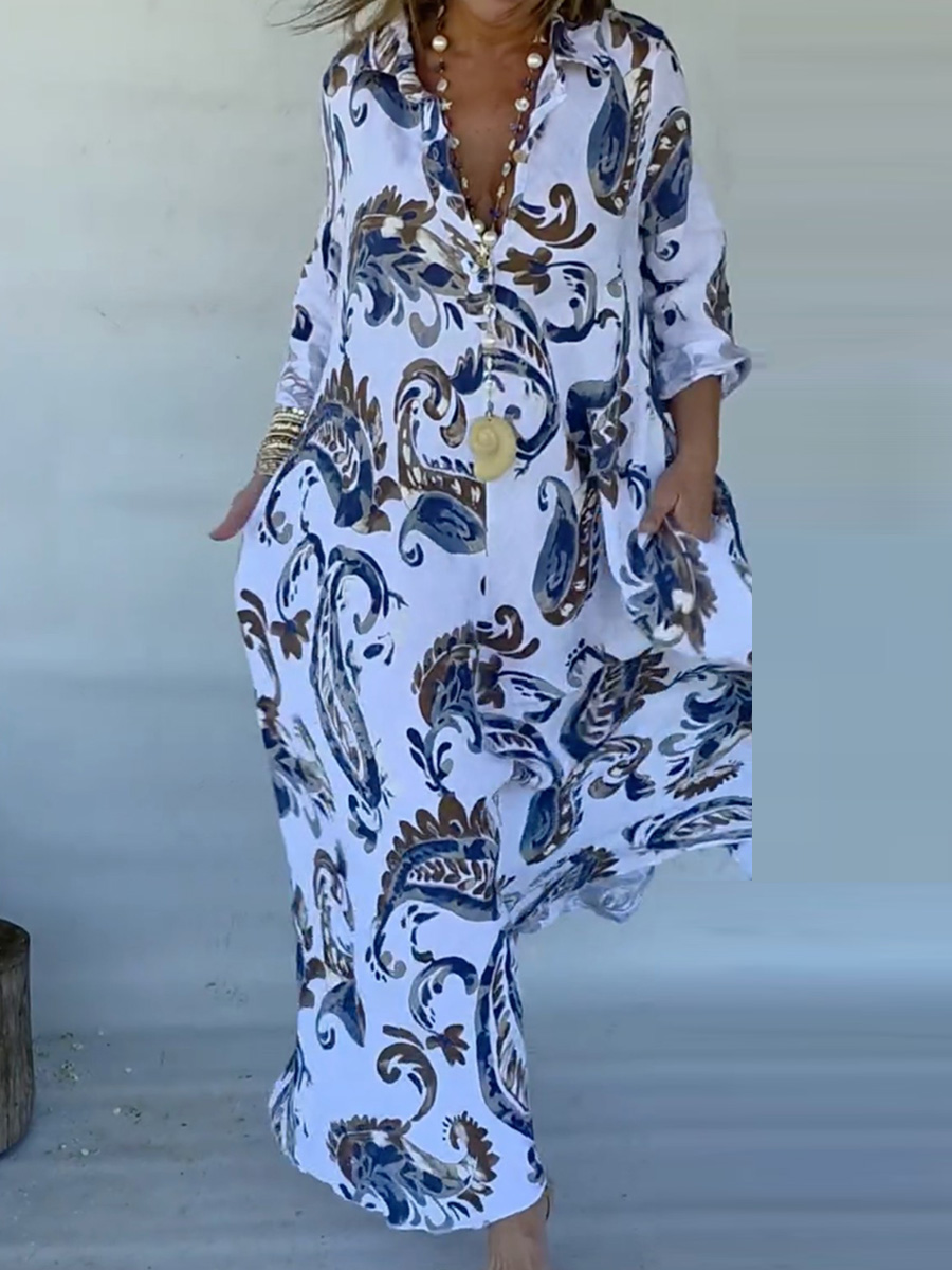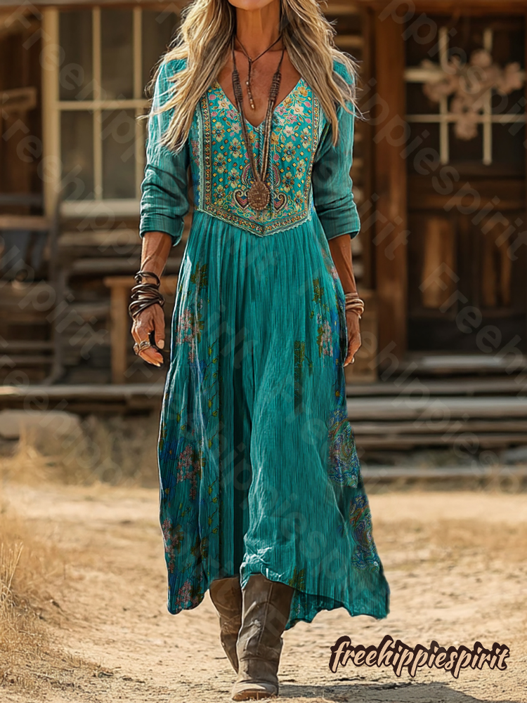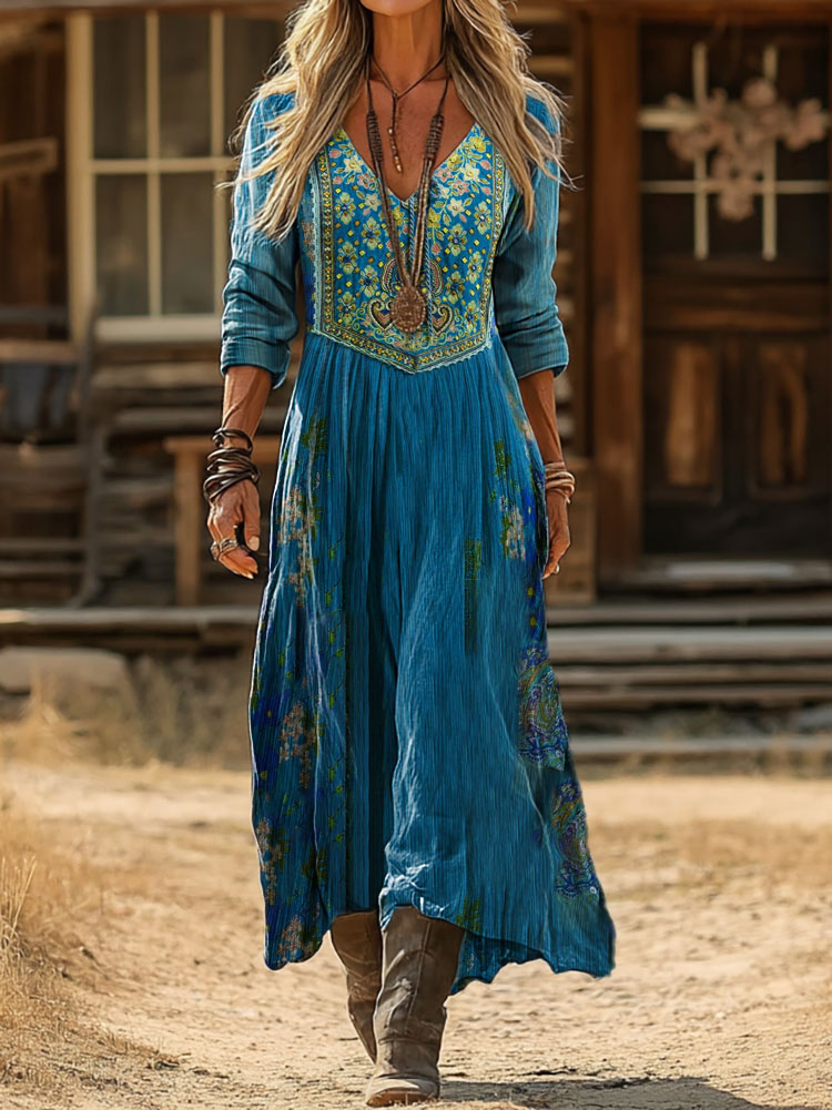 Women's Retro Style Printed V-Neck Long Sleeves Loose Bohemia Maxi Dresses