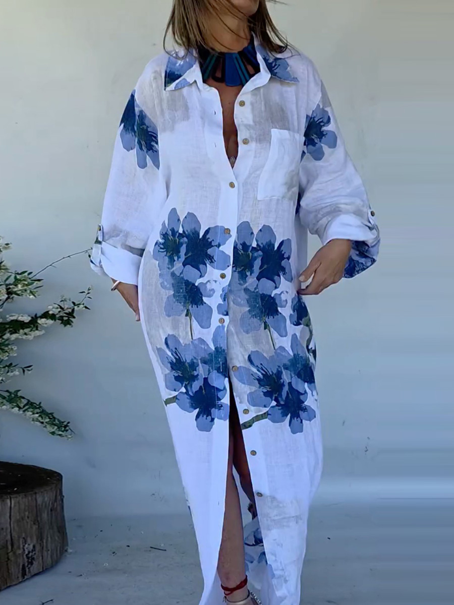 Flower Printed Long Sleeves casual bohemia cover-ups shirt dress