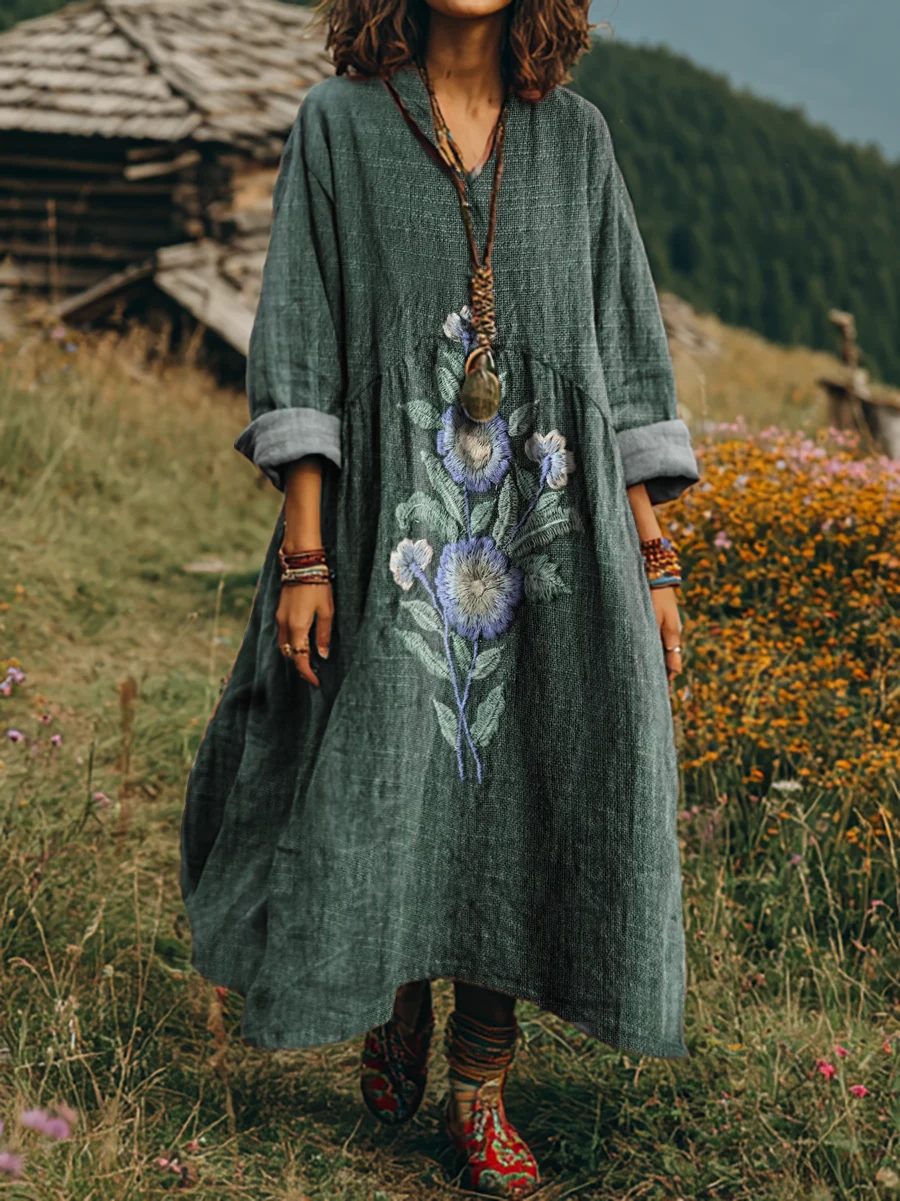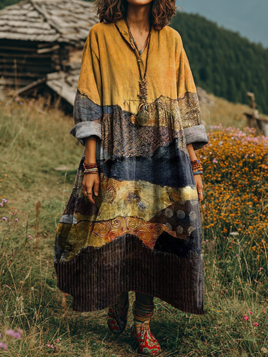 Women's Retro Art Print Casual Long Sleeve V-Neck Cotton Linen Dress