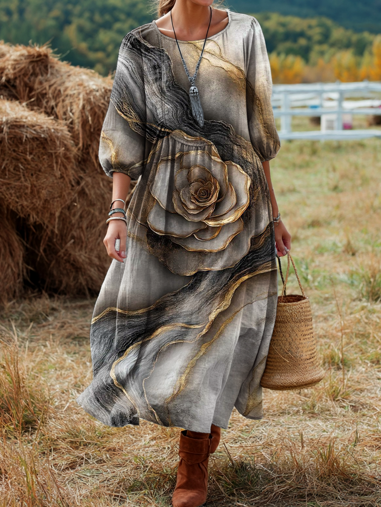 Women's Bohemian Floral Art Print Long-Sleeve V-Neck Comfortable Cotton Dress with Pockets