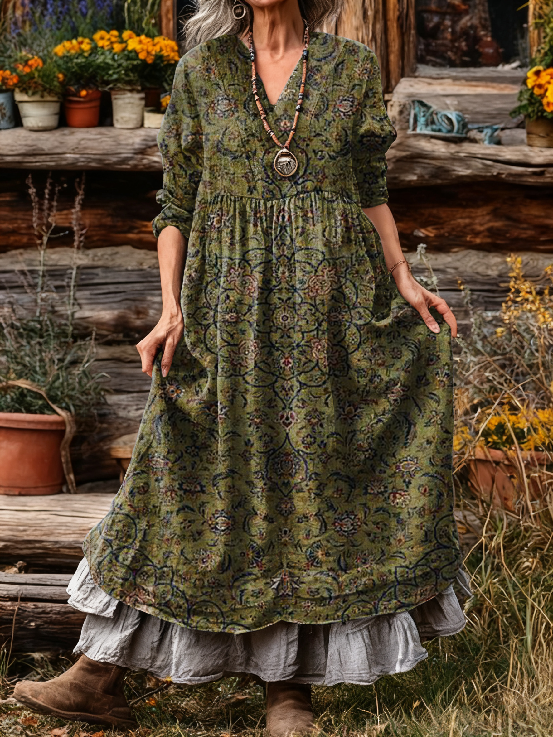 Women's Vintage Ethnic Green Floral Totem Art Printed Casual V-neck Pocket Long Sleeve Dresses