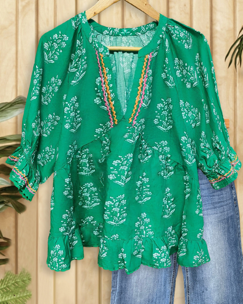 Floral Print Stunning Puff Sleeve V Neck T-Shirt