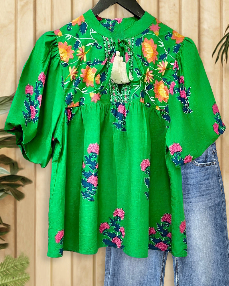 Floral Print Puff Sleeve Stylish Tie Neck T-Shirt