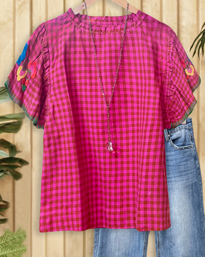 Floral Embroidery Checked Girly Ruffle Sleeve Blouse