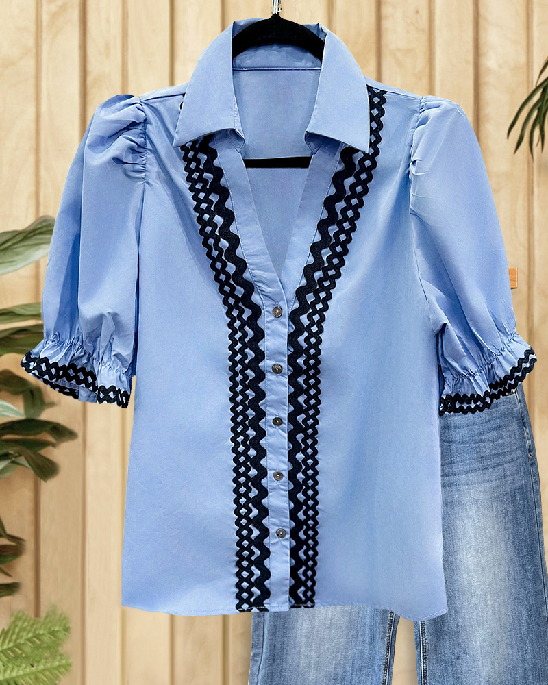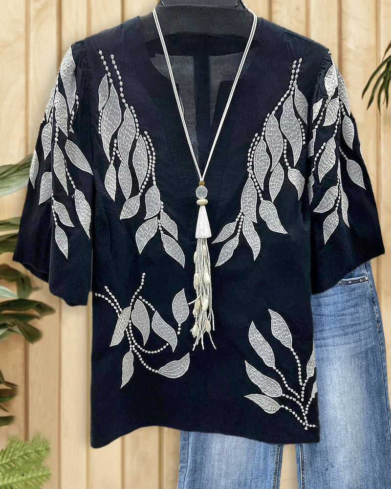 Leaf Embroidery Puff Sleeve Elegant V Neck T-Shirt