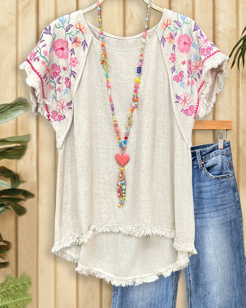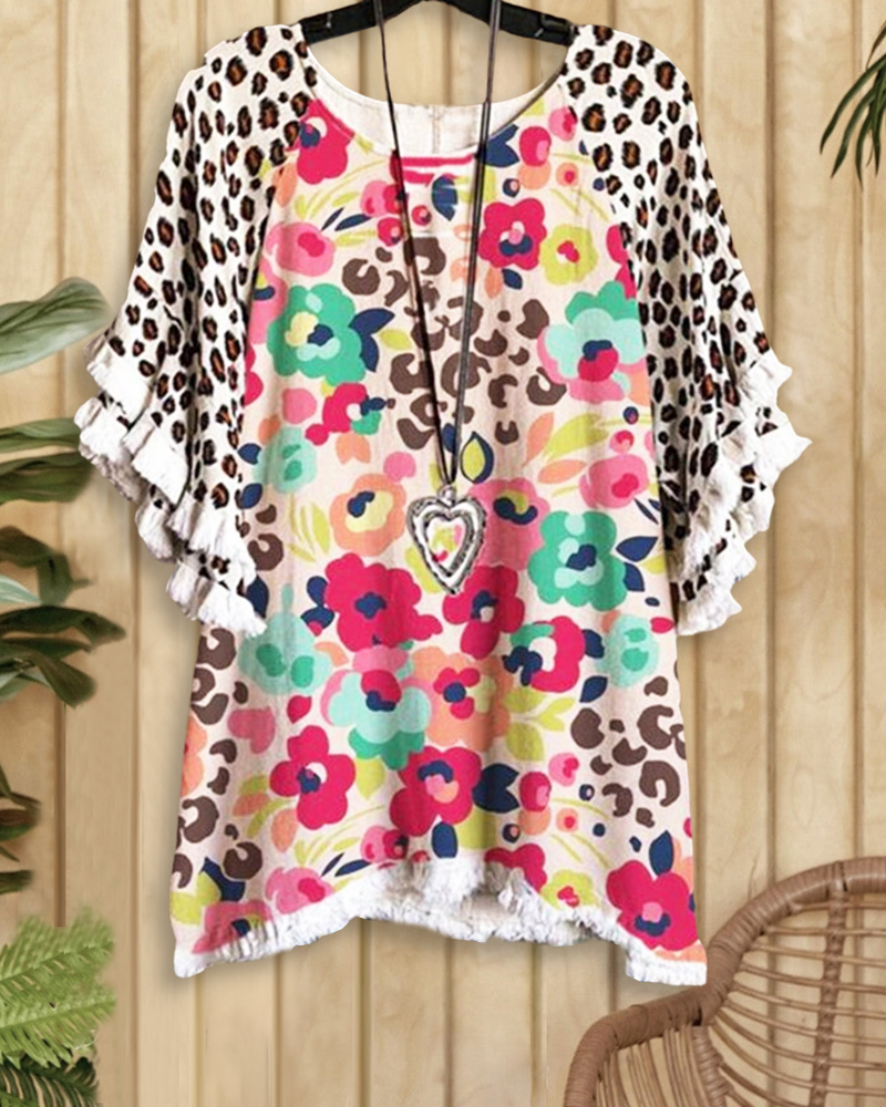Floral Embroidery Puff Sleeve On-trend Leopard Print T-Shirt