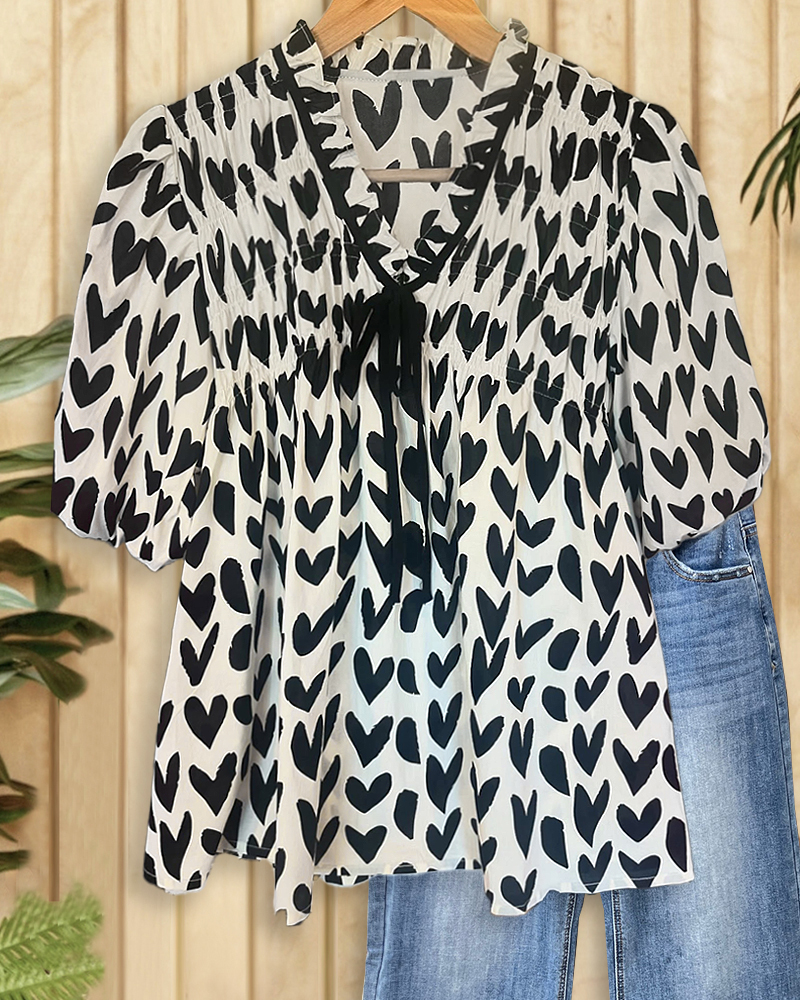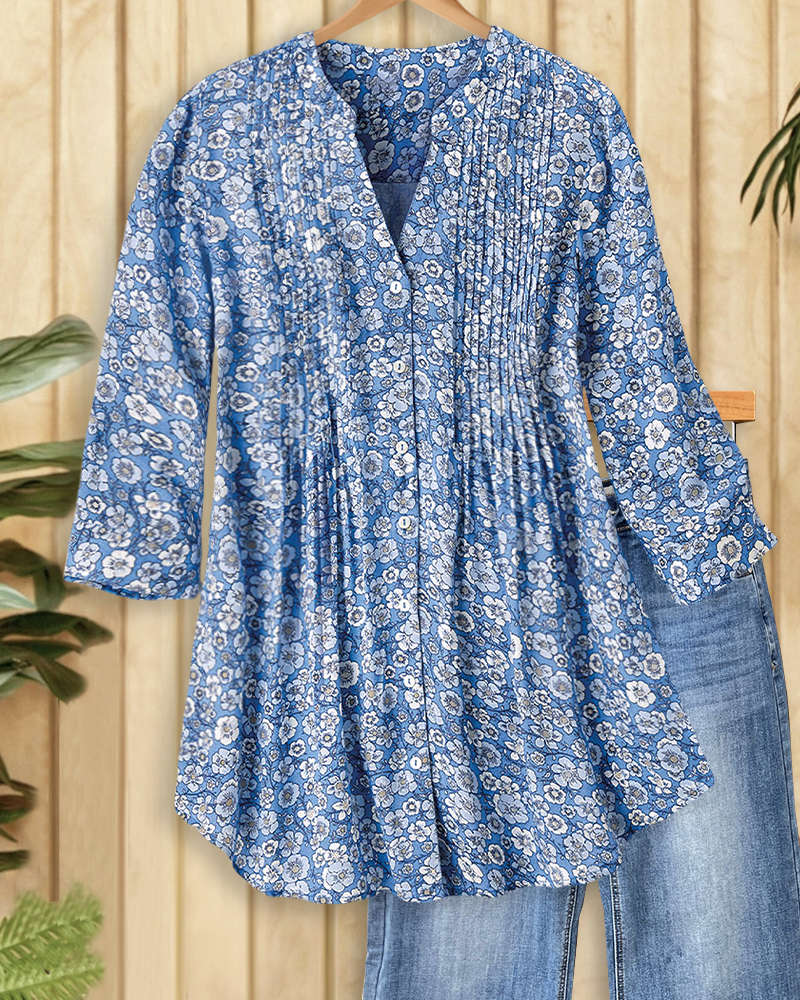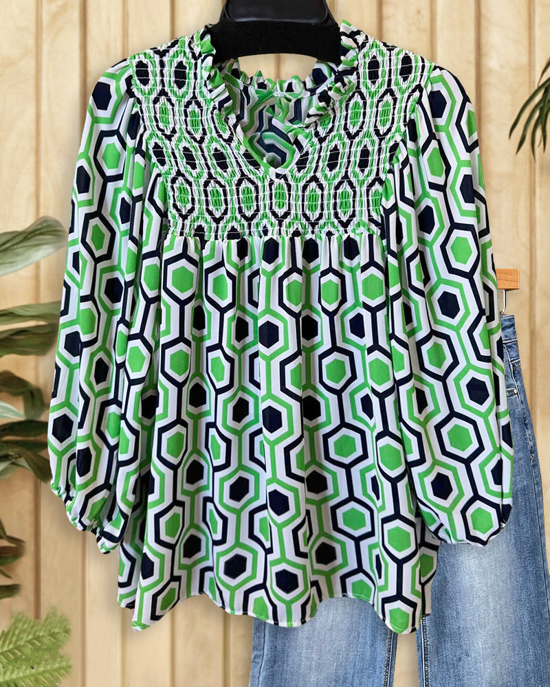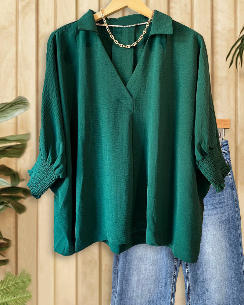 Casual Ruffled Pleated V-neck Cotton Blend Top