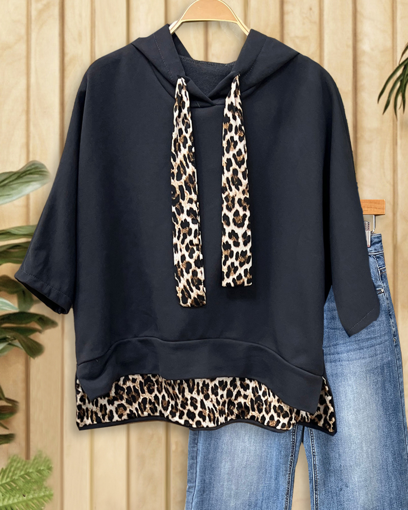 Leopard Print Patchwork Sporty High Low Hooded Top