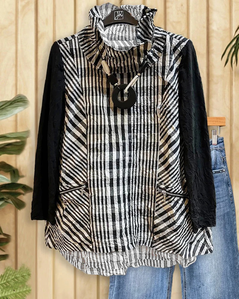 Patchwork Mixed Striped Print Chic Pocket Blouse