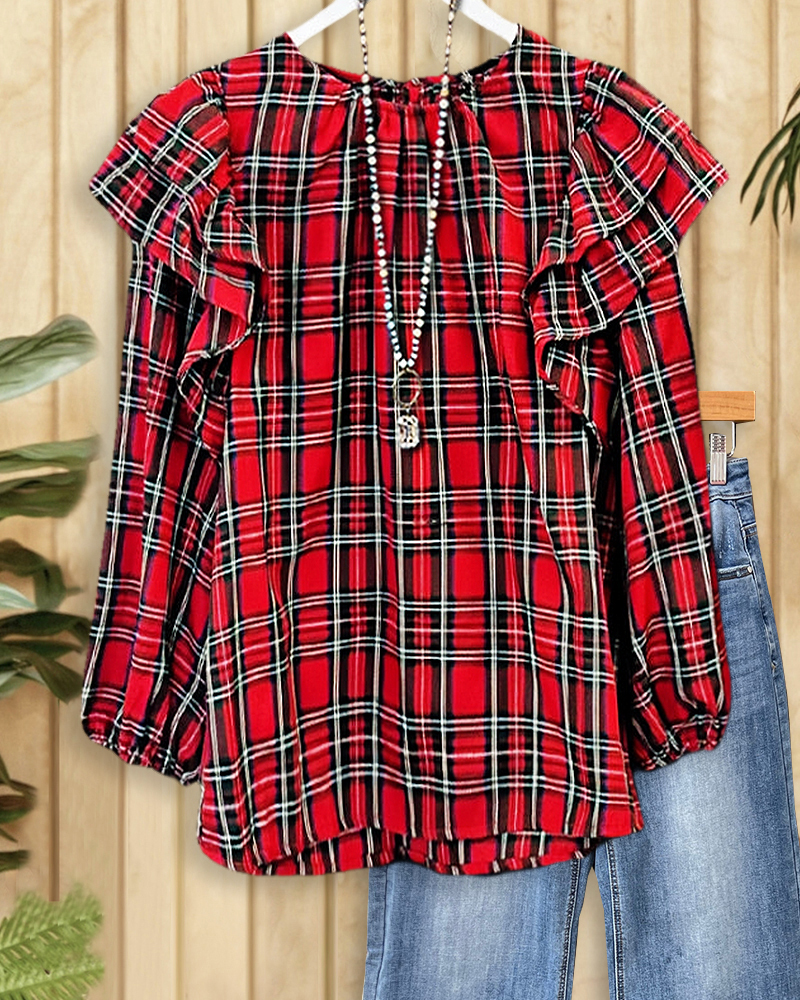 Plaid Pretty Ruffle Shoulder Lantern Sleeve Blouse