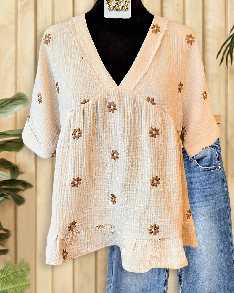 Floral Embroidery Puff Sleeve V Neck Smart Blouse