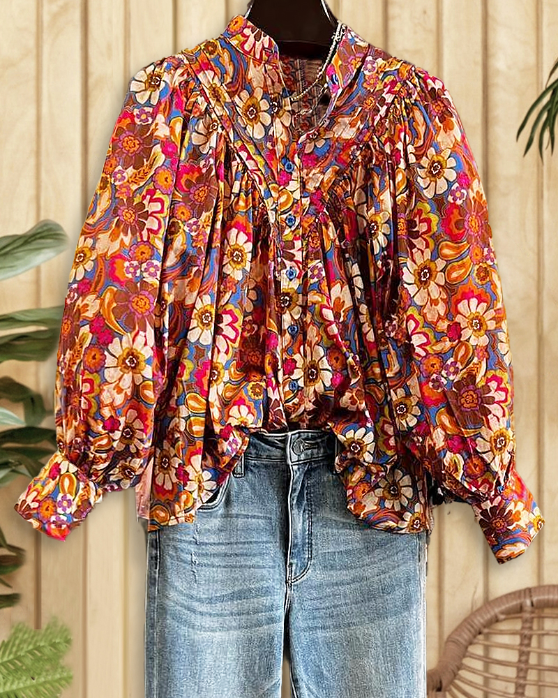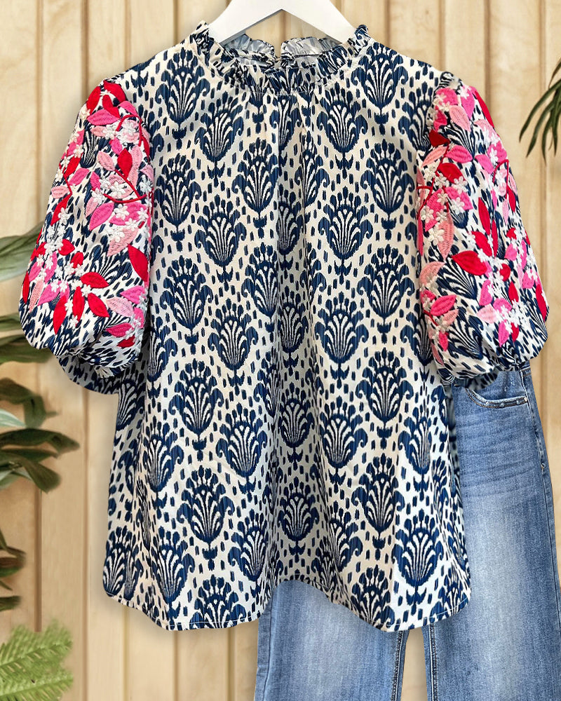 Floral Mixed Print Puff Sleeve Ethnic Ruffled Collar Blouse