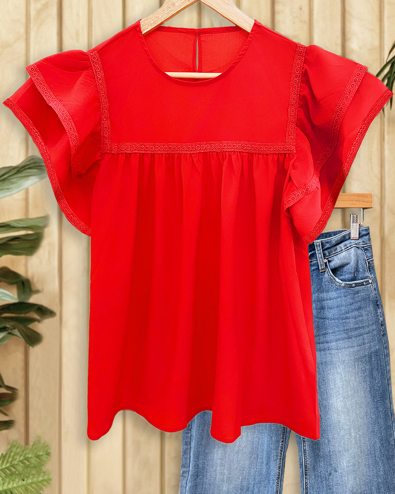 Solid Color Lace Trim Tiered Sleeve Rocking Blouse