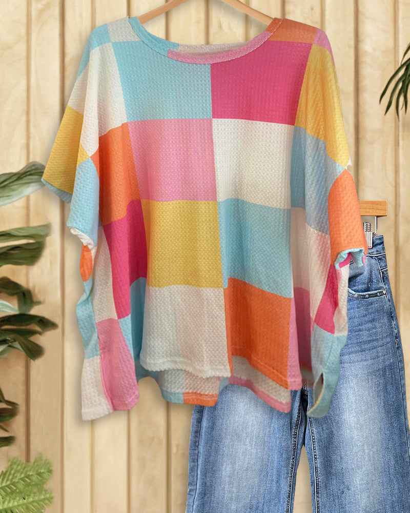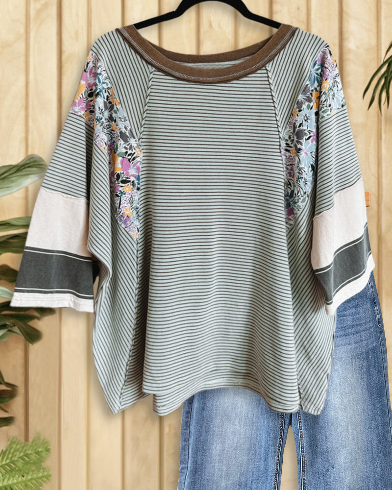 Striped & Floral Print Mixed Patchwork Laid Back T-Shirt