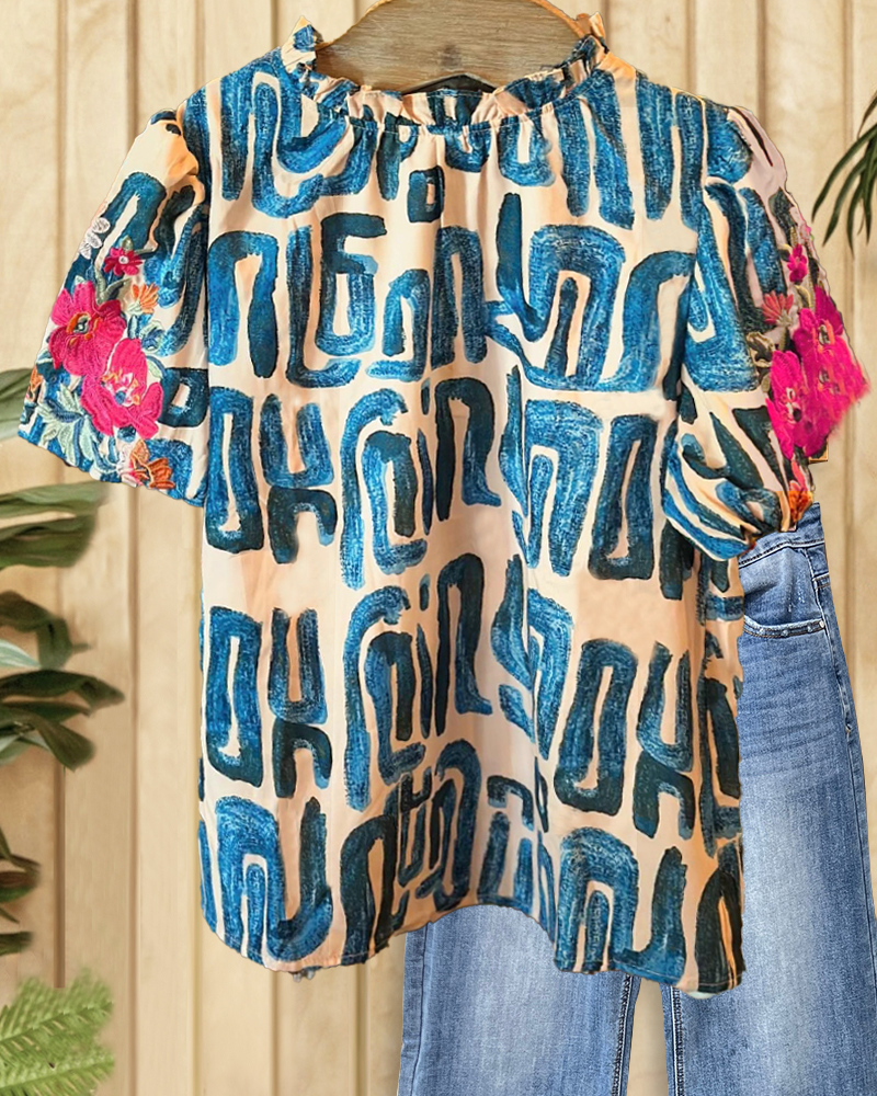 Floral Embroidery & Graphic Print On-trend Puff Sleeve Babydoll T-Shirt
