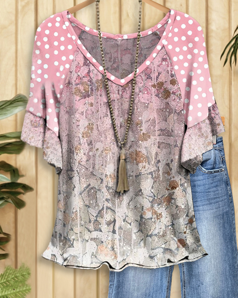Polka Dot & Floral Print Pastoral Raglan Sleeve T-Shirt
