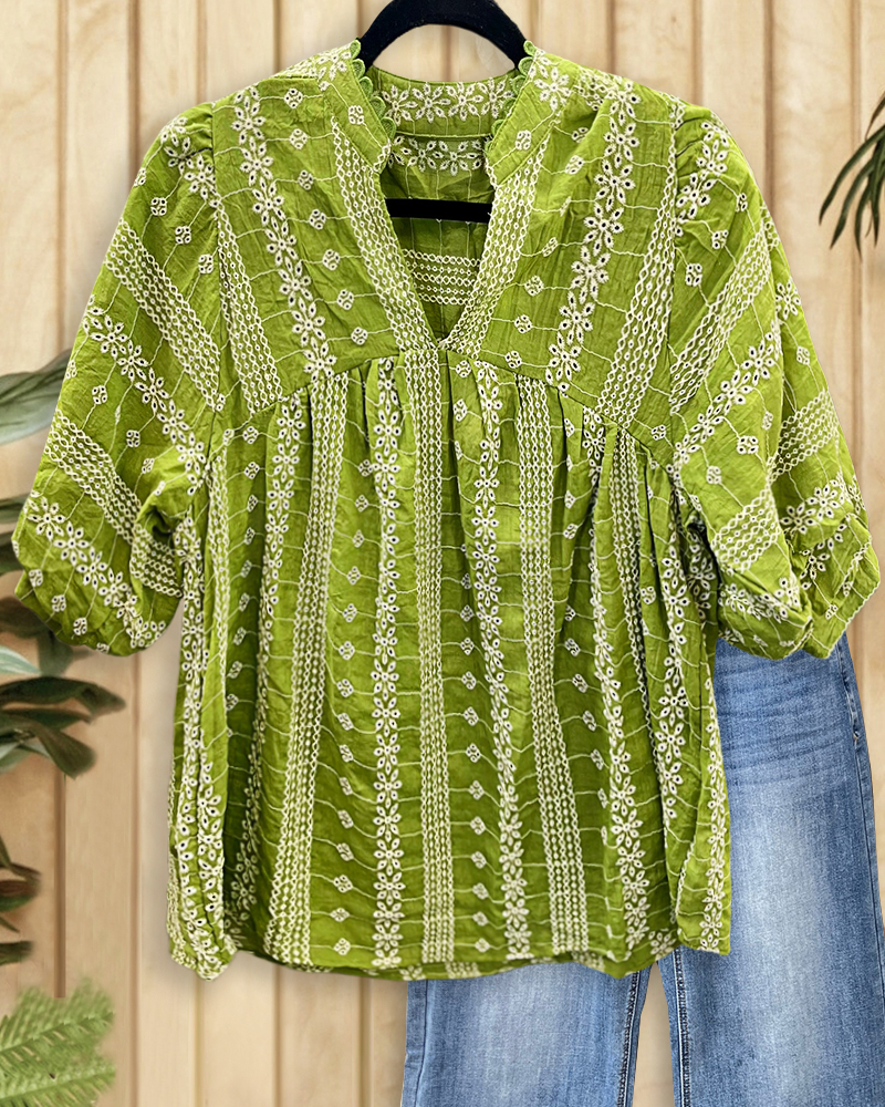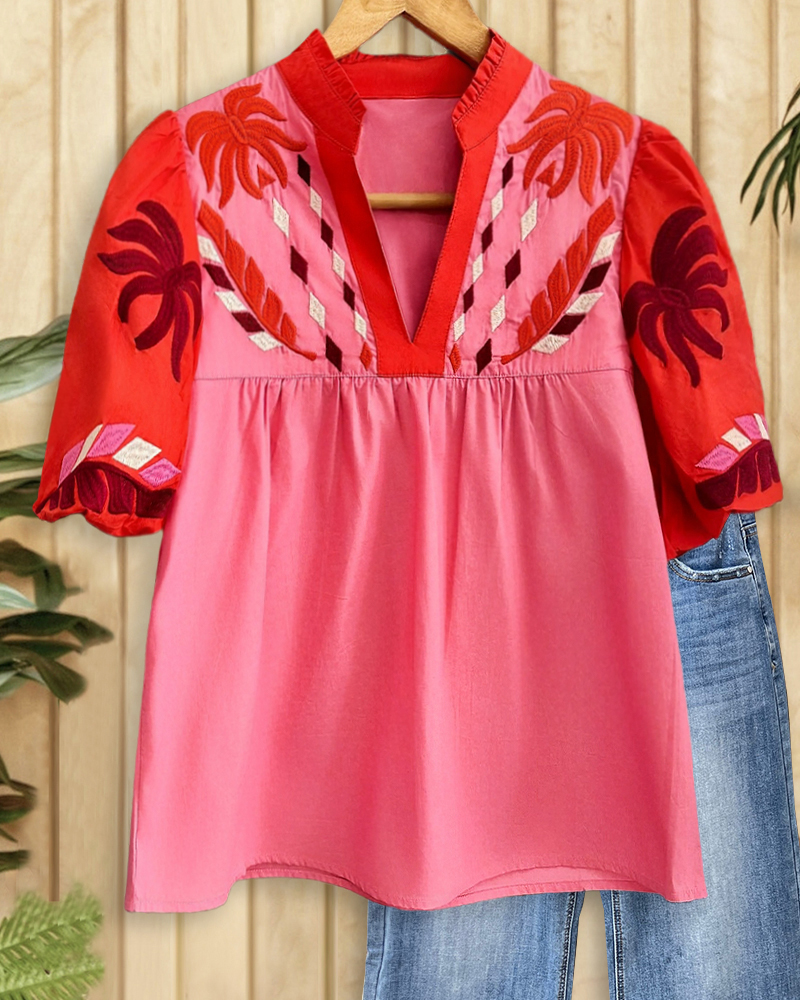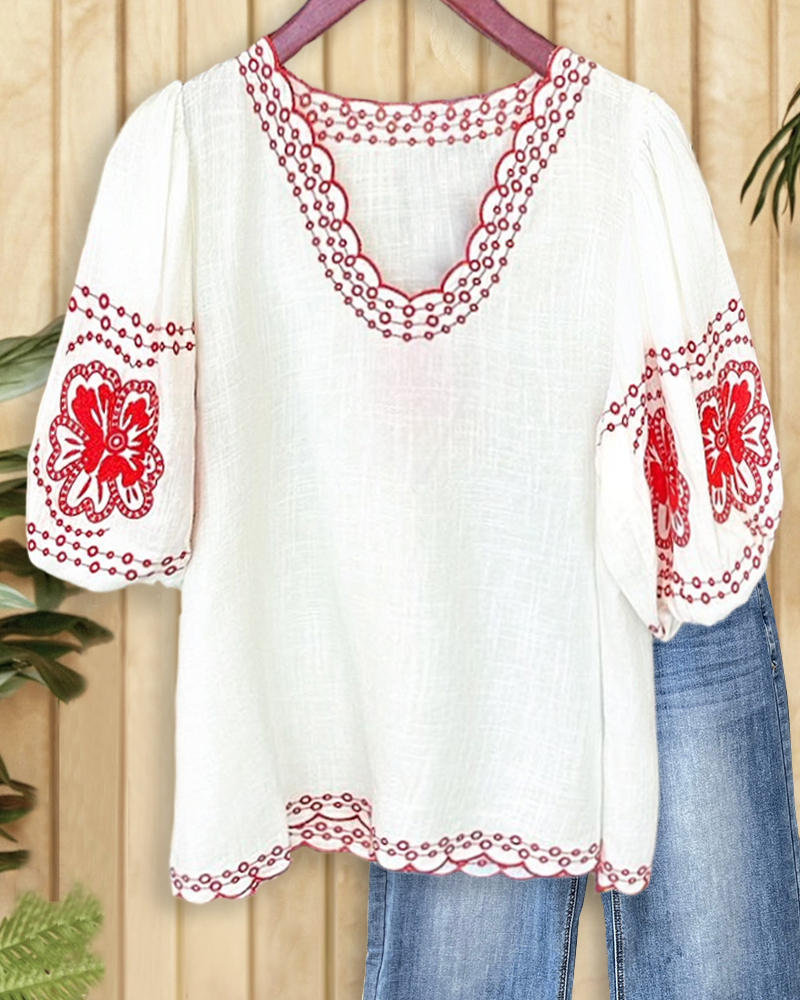 Floral Embroidery Ethnic Puff Sleeve Scalloped V Neck Blouse