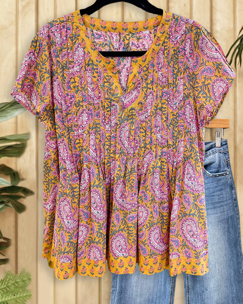 Paisley Mixed Print Bohemia V Neck Pleated Blouse