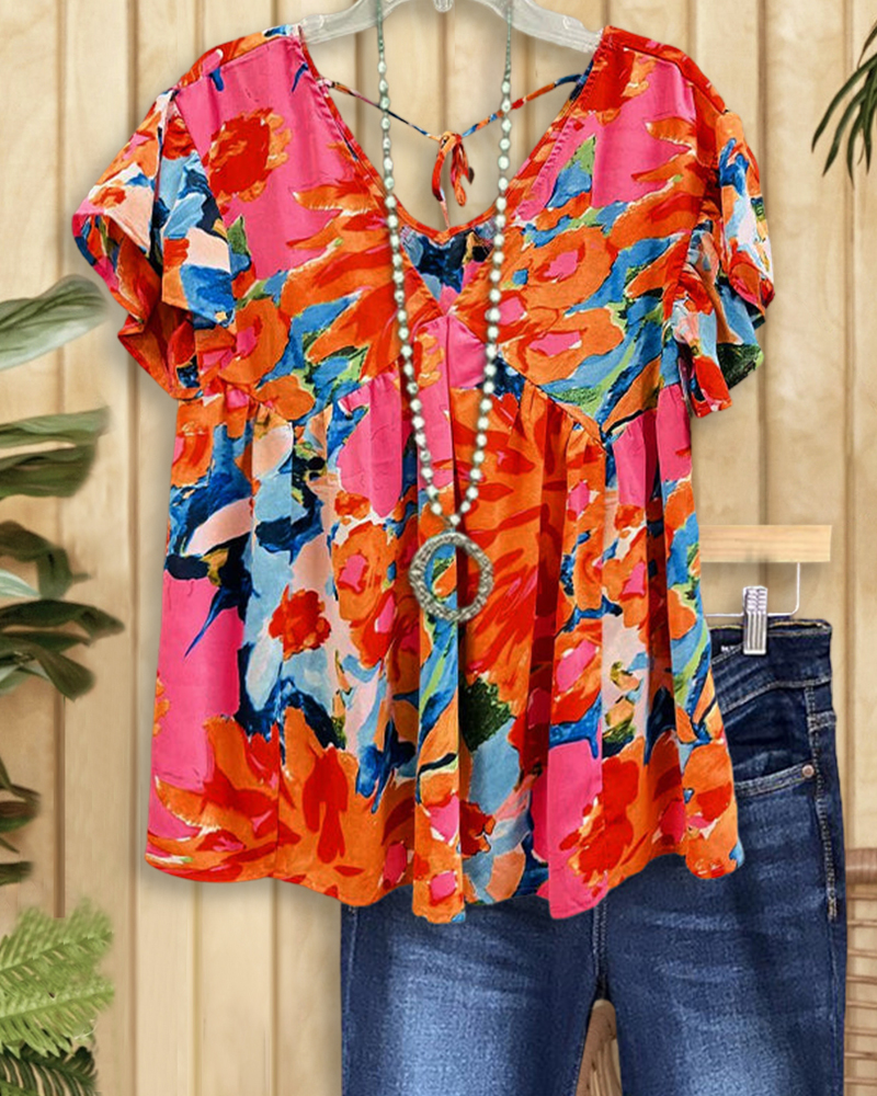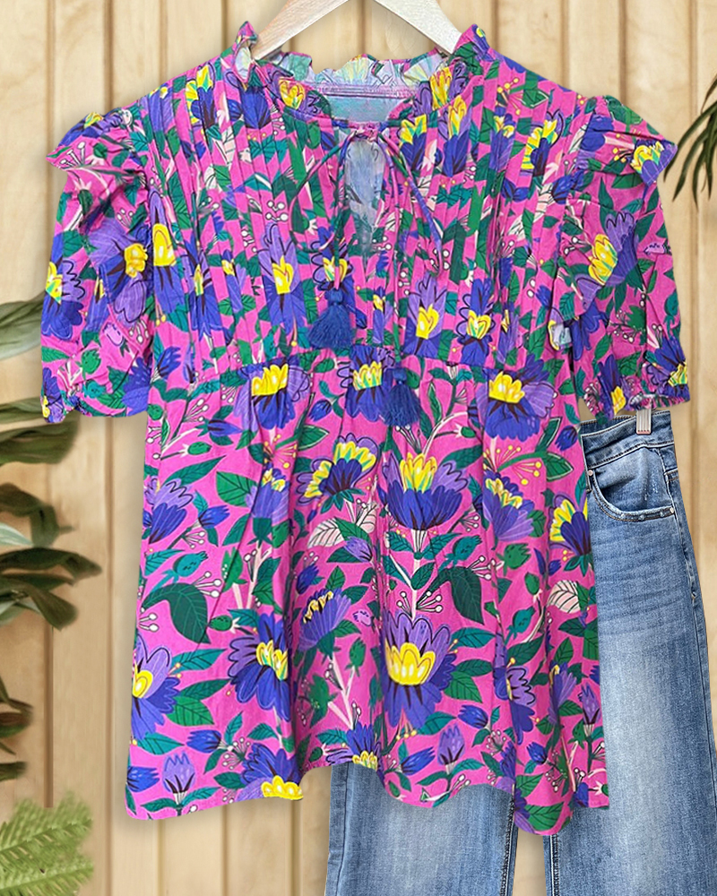 Floral Print Tie Neck Sweet Pleated Ruffled Shoulder T-Shirt