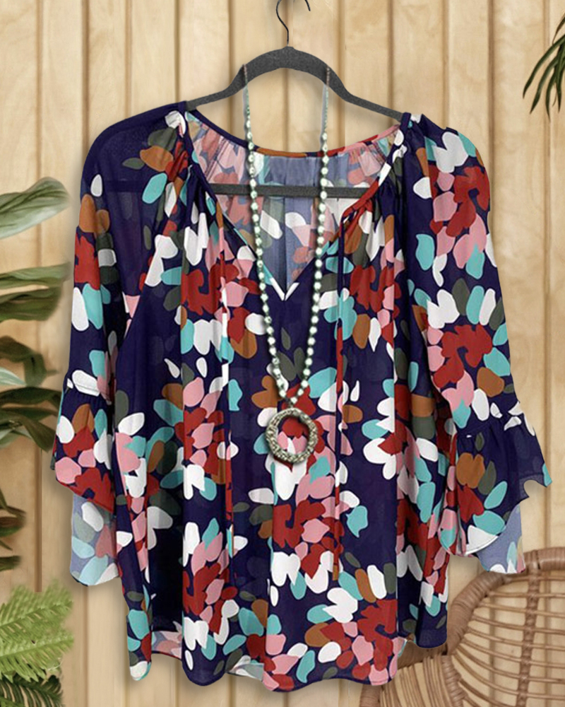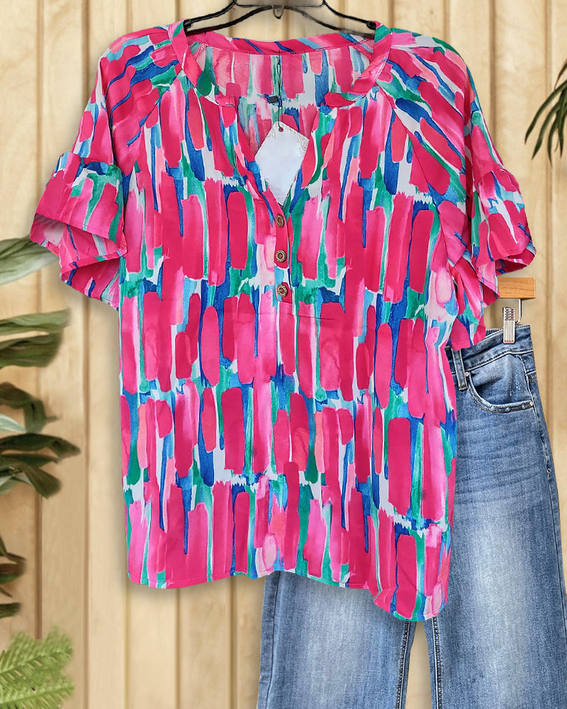Watercolor Print Feminine Ruffle Sleeve Blouse