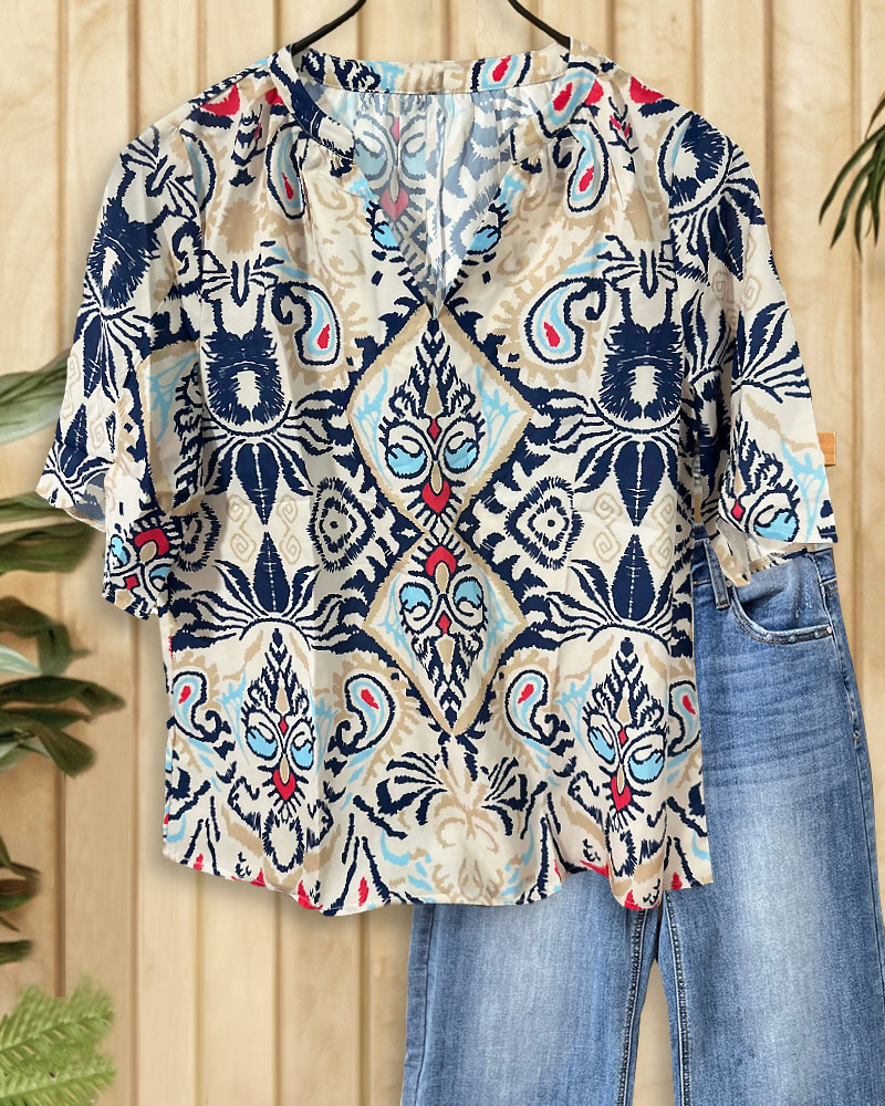 Floral Print Ethnic V Neck Blouse