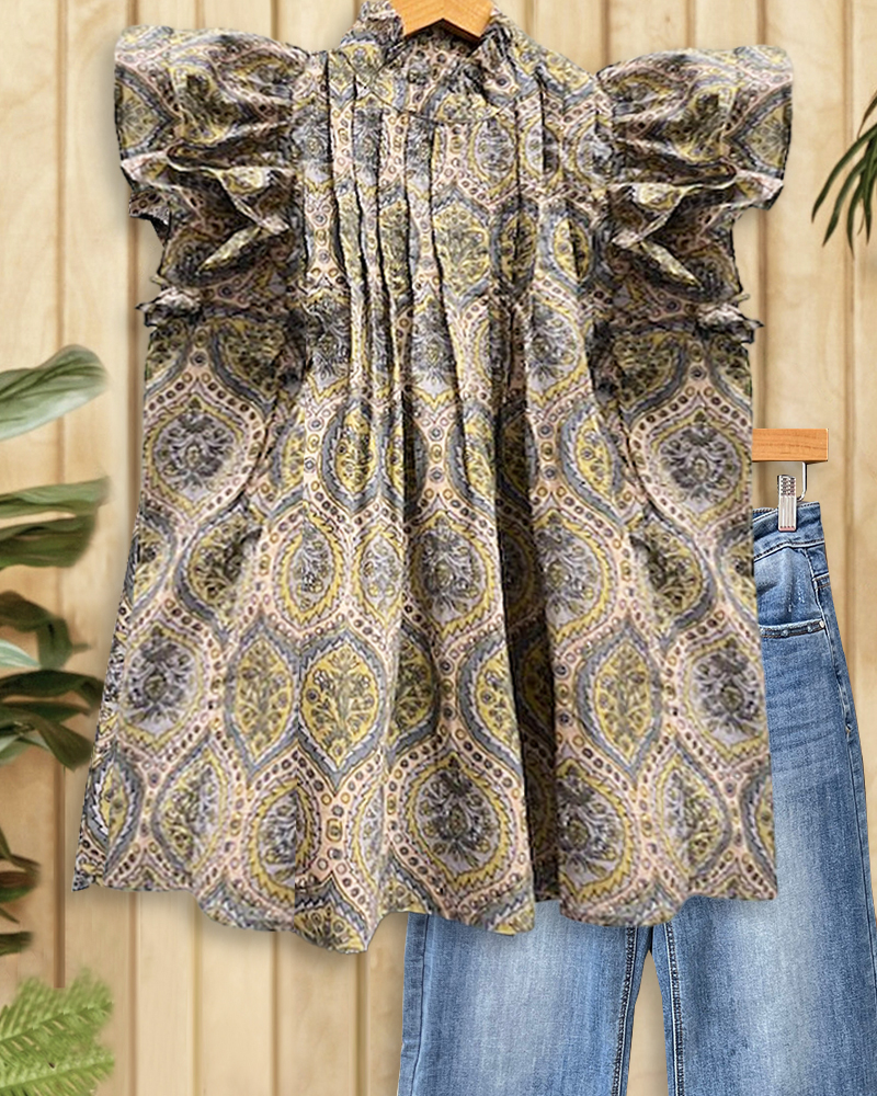 Tribal Print Pleated Detail Retro Ruffles T-Shirt