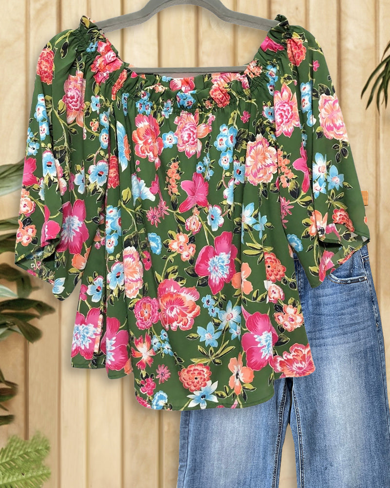 Floral Print Pastoral Boat Neck Blouse