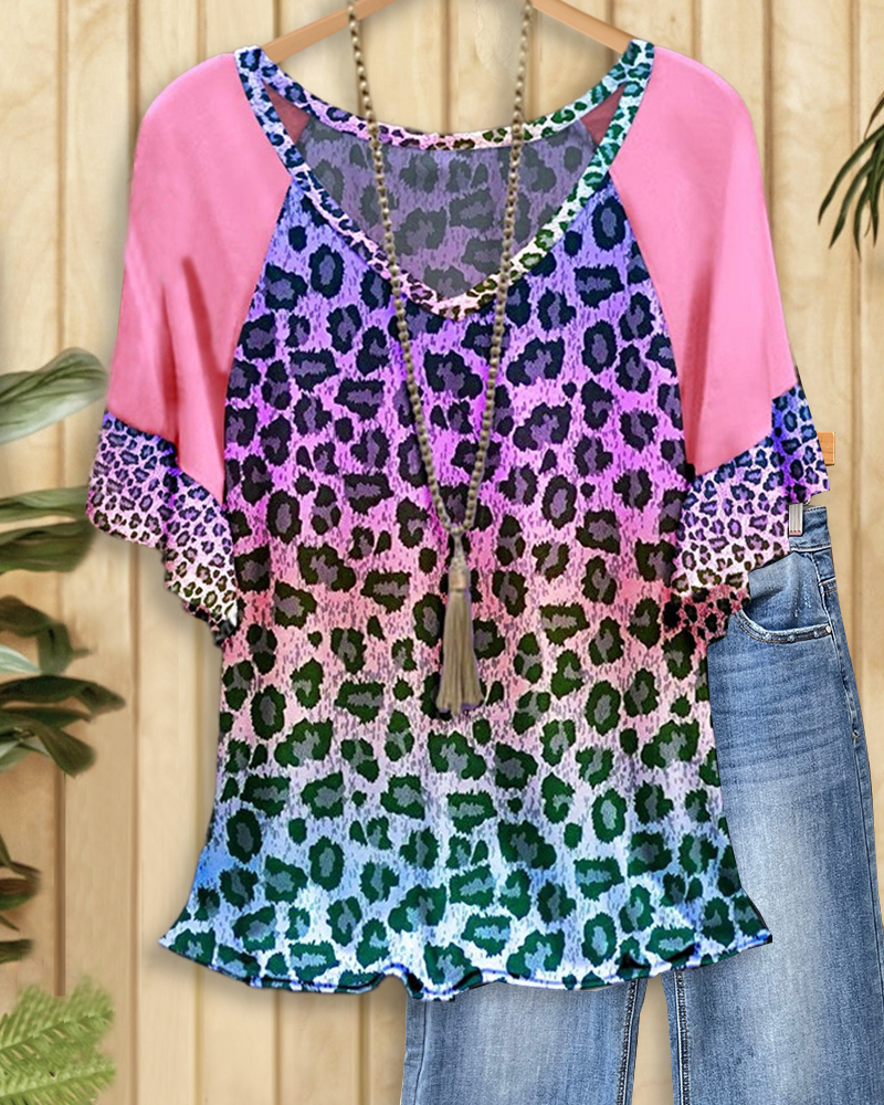 Patchwork Gradient Leopard Print Modern Raglan Sleeve T-Shirt