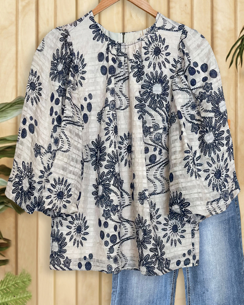 Floral Print Urban Puff Sleeve Round Neck Blouse