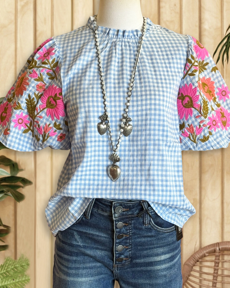 Checked Feminine Floral Embroidery Puff Sleeve T-Shirt