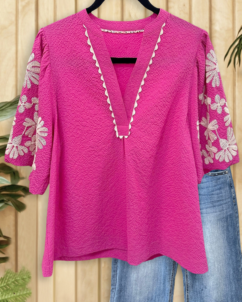 Floral Embroidery Puff Sleeve Retro V Neck T-Shirt