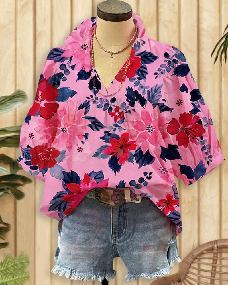 Floral Print Retro V Neck T-Shirt