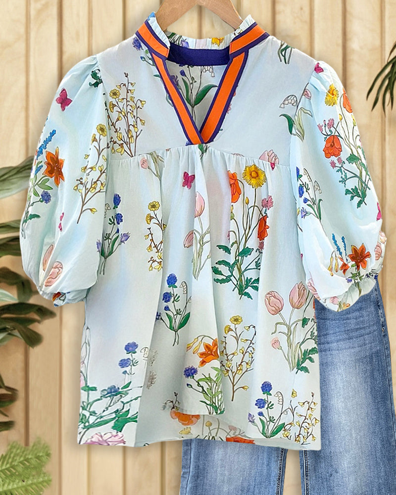 Floral Print V Neck Stunning Puff Sleeve Blouse