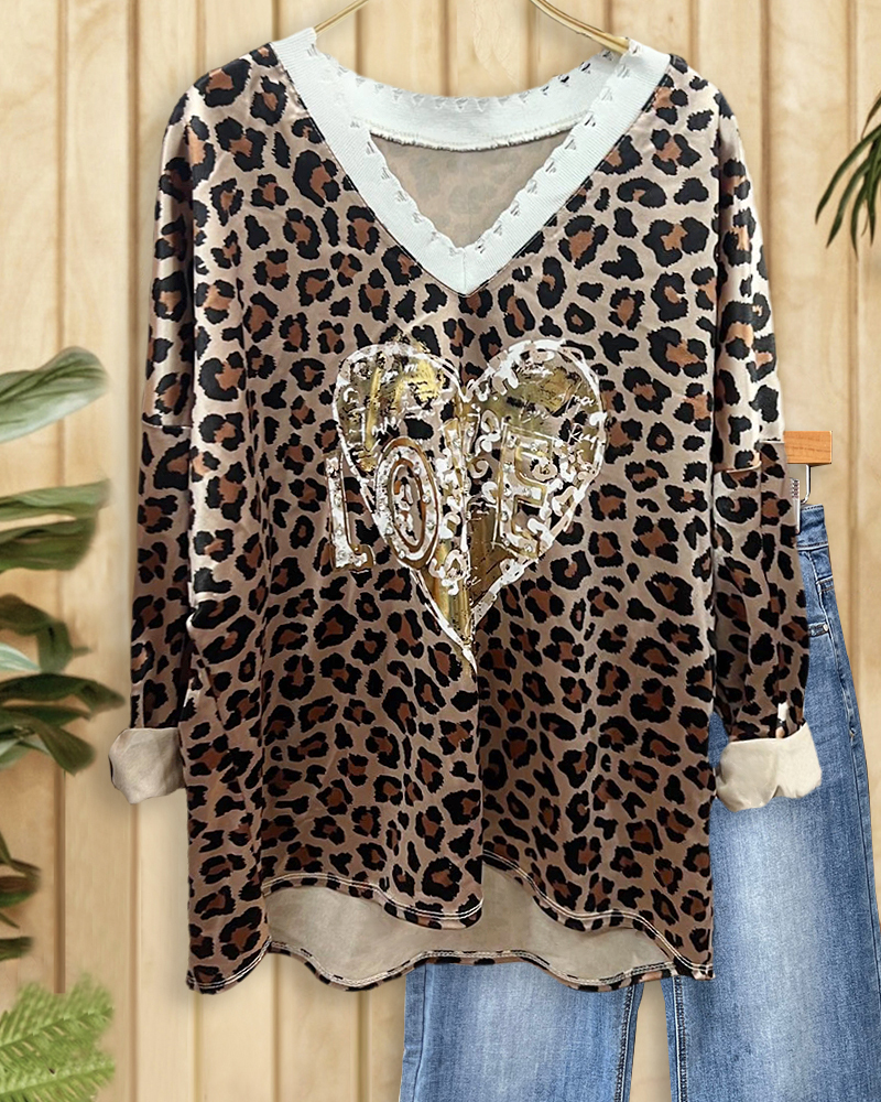 Heart & Leopard Mixed Print Bold V Neck Blouse