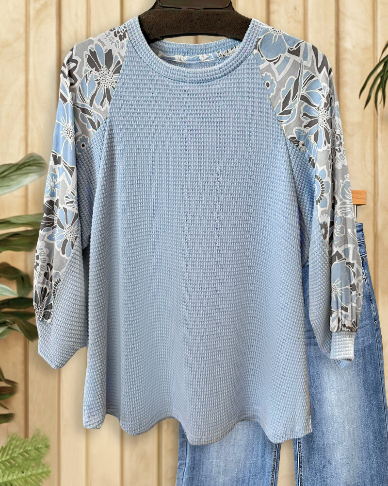 Floral Print Patchwork Elegant Round Neck Waffle Shirt