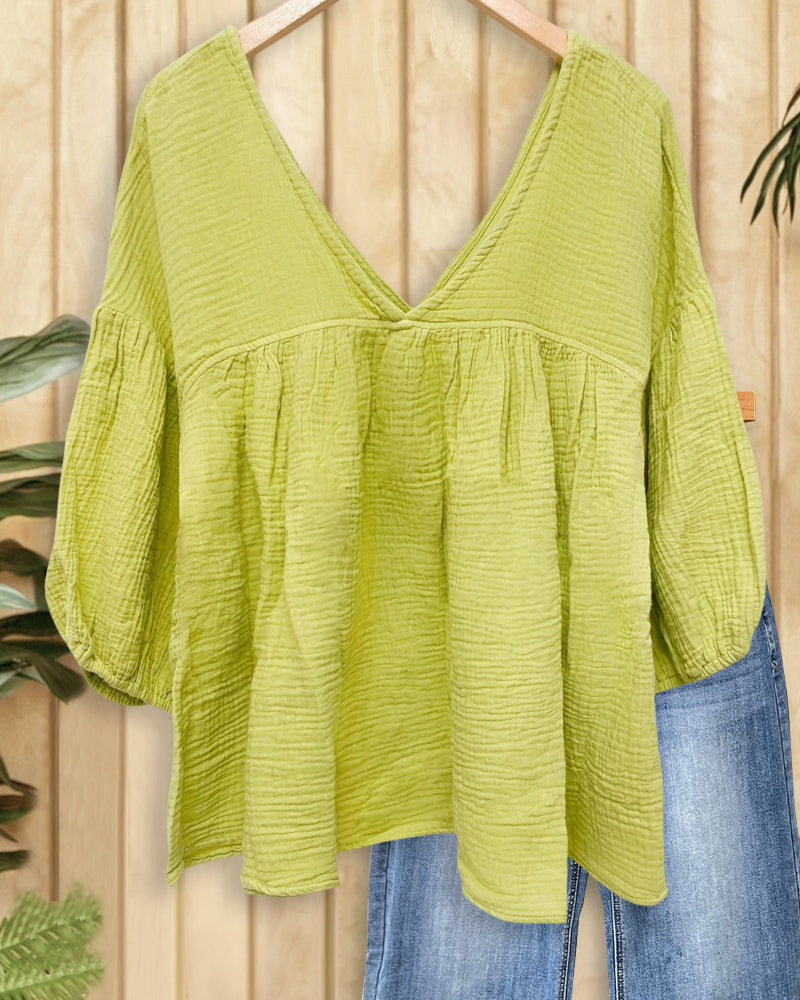 Solid Color V Neck Versatile Babydoll Blouse