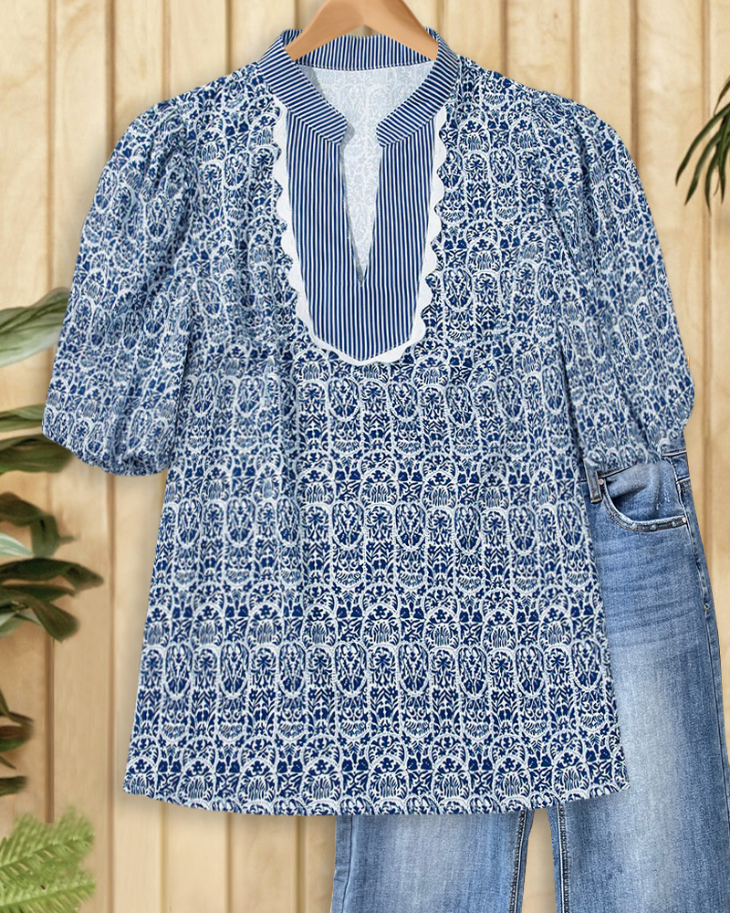 Floral Print Ethnic Scalloped Trim Patchwork V Neck Blouse