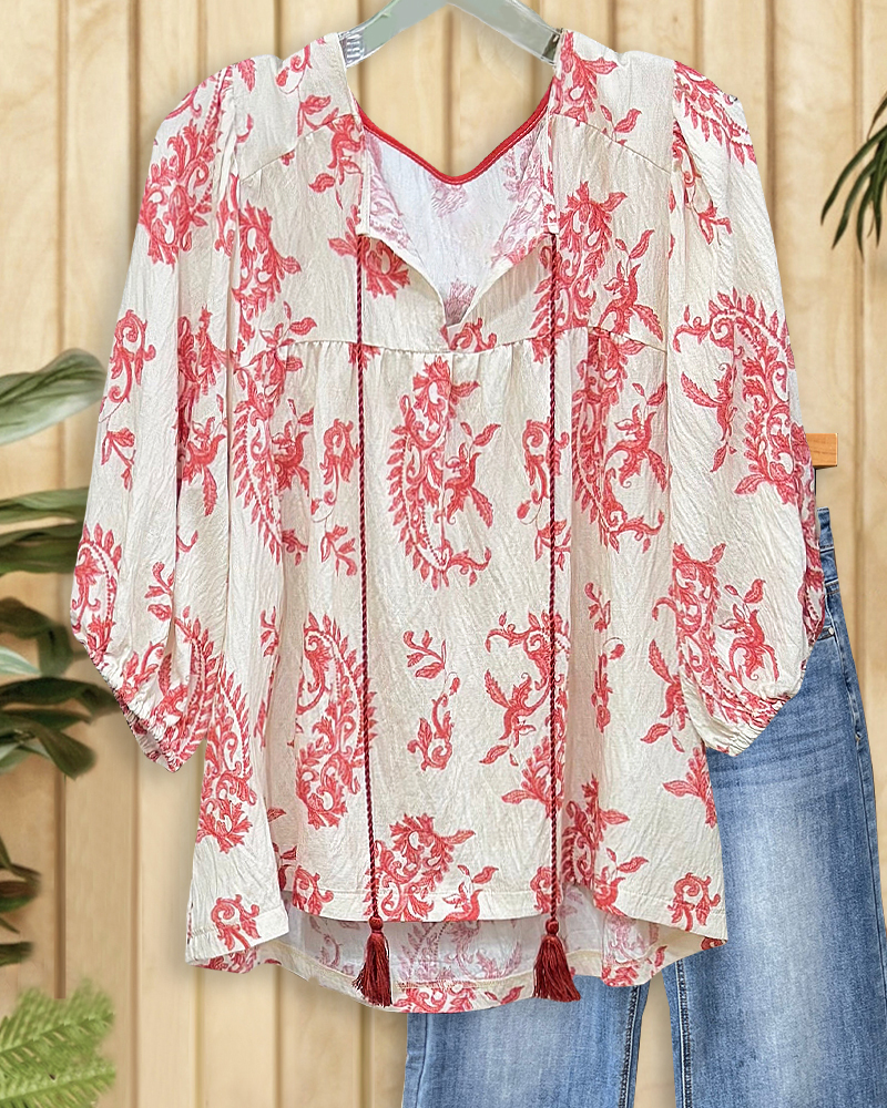 Paisley Bohemia Tie Neck Puff Sleeve T-Shirt
