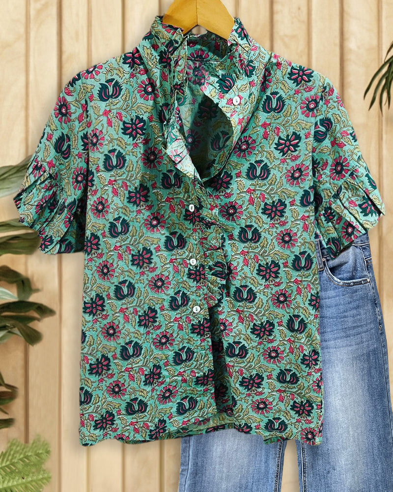Floral Print Elegant Ruffles Trim Button Blouse
